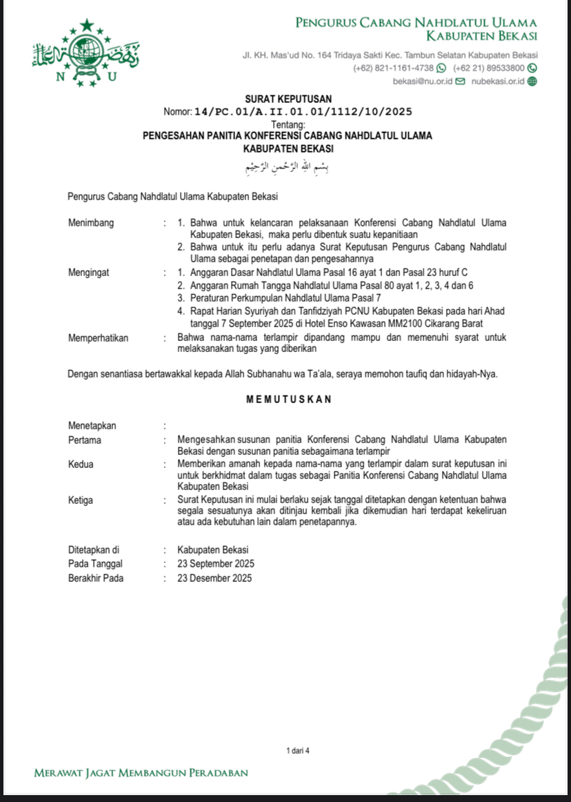 Dengan penetapan tersebut, PCNU Kabupaten Bekasi kini bersiap menyukseskan hajatan penting organisasi yang diharapkan melahirkan kepemimpinan baru yang solid, berkhidmat, dan tetap menjaga tradisi keulamaan di bumi Bekasi.